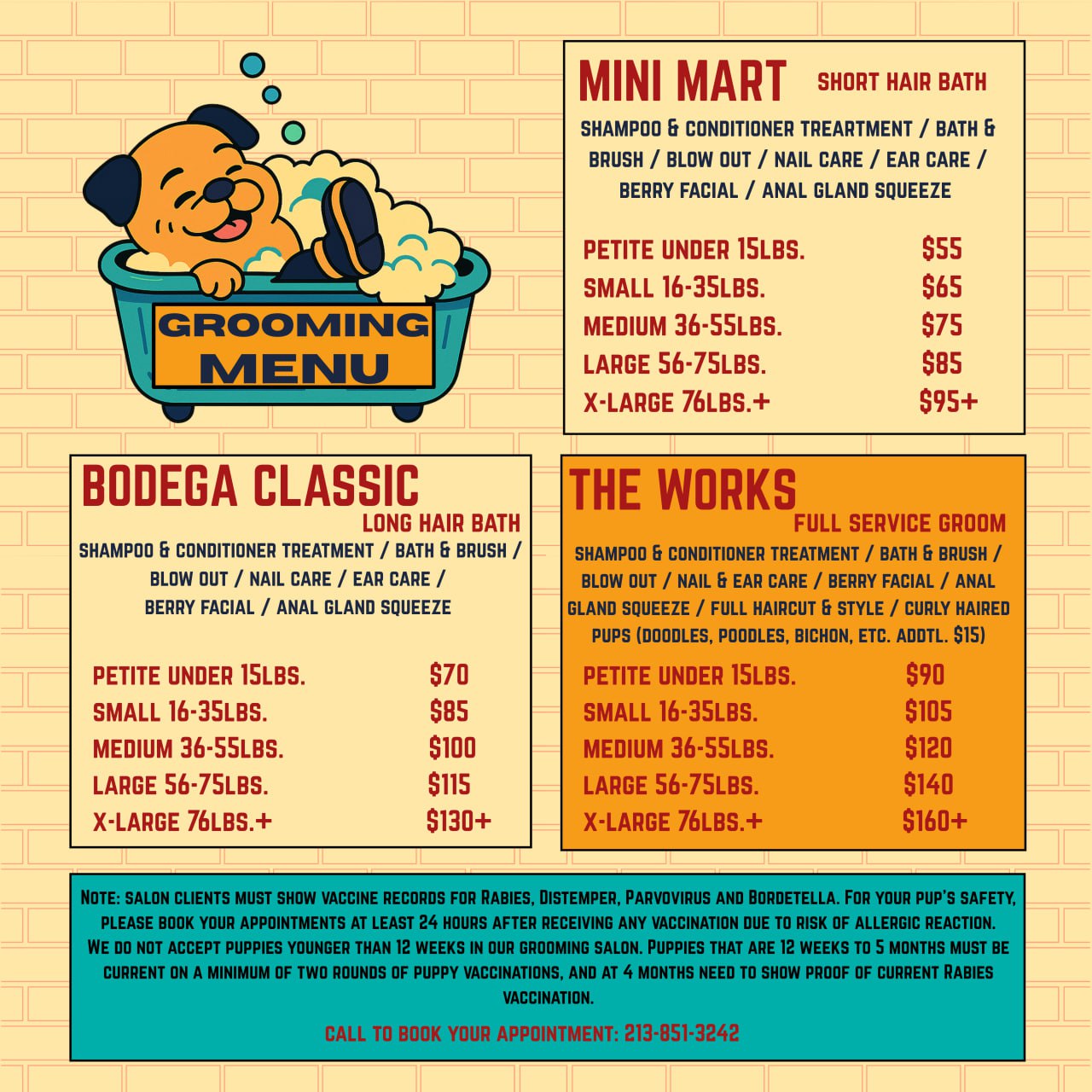Every dog’s got their own vibe, and we’re here for it. Whether your pup needs a full cut, a quick bath, nail trim, or ear cleaning—we’ve got it covered. Fresh, clean, and totally tail-wag worthy.